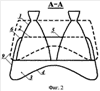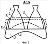Кроме этого, внутренняя поверхность донного насадка может быть не осесимметричной, а в сечениях, перпендикулярных оси ММДУ, иметь форму, составленную из дуг окружностей, огибающих сопла, и плавно сопряженных с ними овалов или эллипсов между соплами. Срез донного насадка может быть не прямым, а может иметь волнообразный профиль с максимальной длиной образующей донного насадка в местах наибольшего удаления наружных поверхностей сопел от оси ММДУ и минимальной длиной образующей между соплами.