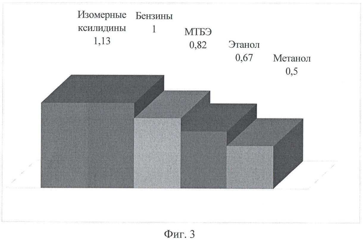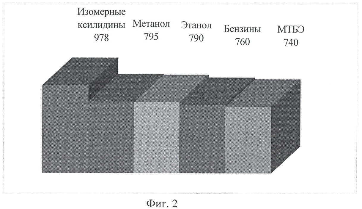 Гистограммы основных физико-химических и эксплуатационных свойств наиболее популярных высокооктановых компонентов представлены на фиг.1, 2, 3.