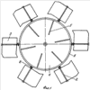 При вращении ветроколеса стержни-оси 2 описывают в пространстве коническую поверхность, а без ветра начальный угол отклонения лопастей от этой поверхности должен быть наименьшим в пределах от 0 до 90°, в зависимости от конкретной задачи. Когда ветер начинает давить на лопасти, то вследствие их несимметричности угол их отклонения увеличивается, чему препятствует пружина 8. При этом кроме прямого ветрового потока, поступающего на лопасти, дует и поток, поступающий из середины общего потока через окна 7. Сумма потоков увеличивает К.И.Э.В. ветроколеса, хотя на движение лопаток 5 и затрачивается небольшая часть полученной энергии.