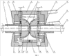 При малых значениях угла смешения осей валов при повороте шарнира в сторону «соосно» сферы необходимо синхронно сближать не расстояние С (фиг.1) и соответственно раздвигать при повороте осей валов в сторону «несоосно». В момент достижения некоторого угла « » (фиг.2) сферы необходимо раздвинуть до совмещения оси сферы с осями цапф цапфовой опоры и сохранять данное положение сфер вплоть до угла поворота +180° (фиг.3). Работа шарнира зеркально повторяется при угле поворота от положения «соосно» вплоть до угла поворота -180°. Таким образом, предложенный шарнир может работать с угловым смещением осей валов, равным 360°.