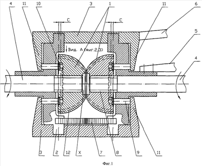 1) С зацеплением посредством зубьев (фиг.1), состоящее из сферической зубчатой пары 1 в виде зубчатых усеченных сфер (далее сфер), поворотных цапфовых опор 2, корпуса 3, ведущего и ведомого валов 4, опоры-подвески 5, рычага управления устройством 6. При этом поворотные цапфовые опоры снабжены цилиндрической зубчатой парой секторов 7 (или двумя парами зубчатых секторов). При этом зубчатые сферы 1 соединяются с валами посредством подвижного шлицевого соединения 8, которое позволяет зубчатой сфере перемещаться по валу вдоль его оси. При этом в зоне зацепления X в месте пересечения зубьев и схода их на нет выполнена выточка в обеих зубчатых сферах. При этом число зубьев ведомой сферы всегда должно быть равно числу зубьев ведущей сферы. При этом в цапфовые опоры встроены толкатели 9, которые нажимают на кольца встроенных в зубчатые сферы упорных подшипников 10. Названные толкатели приводятся в движение кулачками 11, выполненными за одно с корпусом. При этом зубья сфер выполнены со сферической начальной поверхностью 12. Однако зубья сфер имеют переменную высоту, а именно ближе к усечению они ниже и соответственно уже, а в зоне экватора имеют максимальную высоту и ширину. Поперечный профиль зуба должен обеспечивать правильное зацепление и может быть, например, эвольвентным.