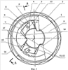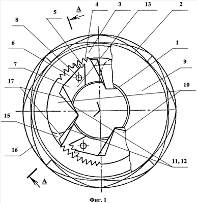 При изготовлении клапана по первому варианту (фиг.5) на одной радиальной плоскости 11 или на обеих радиальных плоскостях 11 и 12 (фиг.6) секторной рабочей зоны 10 лепестка 7 выполнены расточки 17 в форме лопатки, с выборкой переменной глубины по одному из ребер между радиальной плоскостью 11 или 12 и плоскостью лепестка со стороны входящего потока. Каждая из расточек 17, за счет выборки переменной глубины, имеет расширенную часть на периферийной части секторной рабочей зоны лепестка и сужается к противоположному ребру между радиальной плоскостью 11 или 12 и плоскостью 13 секторной рабочей зоны лепестка и к центу запорного органа.