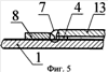 На фиг.5 показан чертеж, иллюстрирующий узел крепления концов оболочки к трубопроводу, где: 1 – трубопровод, 4 – тонкостенное технологическое кольцо, 12 – слой, образованный самотвердеющей массой, 7 – сварной шов, 8 – внешнее технологическое кольцо, 13 – концевая разрезная муфта.
