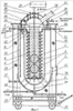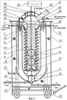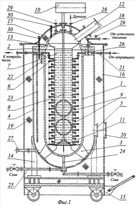 1. Устройство для захолаживания топлива, содержащее основную емкость 4 топлива и расположенную внутри нее дополнительную емкость 1, крышку 2, змеевик 6, теплоизоляцию 19, трубопроводы подачи 22 и отвода 23 топлива, отличающееся тем, что устройство имеет вертикальную конструкцию и дополнительно содержит защитный кожух 16, крышку 17 кожуха 16, технологический люк 20, перфорированный экран 7, датчик 30 температуры, датчик 29 давления, датчик 27 уровня топлива, трубопровод 21 подвода топлива в основную емкость 4, причем основная 4 и дополнительная 1 емкости, их крышка 2, защитный кожух 16, крышка 17 кожуха 16 и перфорированный экран 7 взаимно соосны, а змеевик 6 расположен внутри дополнительной емкости 1 и выполнен в виде двух спиралей, размещенных одна в другой в кольцевом пространстве между перфорированным экраном 7 и стенками дополнительной емкости 1, при этом спирали имеют зазоры относительно стенок дополнительной емкости 1 и стенок перфорированного экрана 7, входной конец змеевика 6 соединен с трубопроводом 21 подвода топлива, а выходной конец змеевика 6 соединен с трубопроводом 22 подачи топлива в основную емкость 4.