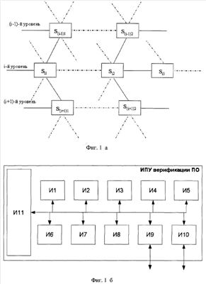 8. Система интерактивного управления (СИУ) содержит на каждом уровне верификации ПО РВК Sij интерактивных программируемых устройств (ИПУ) верификации ПО, где Sij, i=0, 1, , I, j=1, 2, , Qj, I – число уровней верификации ПО, Qj – число ИПУ верификации ПО на i-м уровне верификации ПО, каждое из Sij ИПУ i-го уровня соединено, по крайней мере, с одним ИПУ (i-1)-го уровня или ИПУ (i+1)-го уровня, при этом каждое Sij ИПУ i-го уровня верификации ПО содержит: аппаратно-программный блок (АПБ) лексического и семантического анализа/разбора, АПБ преобразования кода, АПБ анализа кода, АПБ процессорного управления, видеоадаптер, интерфейсы жестких, гибких и оптических дисков, интерфейс последовательного порта, сетевой интерфейс и системную память, которые объединены системной шиной, при этом системная память содержит постоянное запоминающее устройство (ROM) и оперативное запоминающее устройство (RAM/ОЗУ), в ячейках оперативной памяти и жестких дисков размещают/записывают операционные системы, прикладные программы, базы данных и базы знаний, которые содержат листинги исходных программ, грамматику языка программирования (например, грамматику языка программирования Си), правила преобразования дерева разбора листинга программы, дерево разбора листинга программы, таблицу типов языка программирования, аннотации внешних функций, включающие их грамматику и семантику, код программ на языке внутреннего представления, условия корректности языка внутреннего представления исходного кода программы, условия проверки корректности подозрительных точек исходного кода программы, информационную базу, содержащую системы ограничений в виде алгебраических уравнений и неравенств, отчеты об обнаруженных уязвимостях программного кода, включающие: указание на местоположение возможной уязвимости в исходном коде программы, которое содержит имя файла листинга программы, номер строки и номер позиции в строке программы, в котором возможно переполнение буфера запоминающего устройства, контекст исходной программы, содержащий возможное переполнение или некоторую «окрестность» потенциально опасной точки переполнения буфера запоминающего устройства; указание причины переполнения буфера запоминающего устройства – значения исходных переменных, приводящих к возникновению уязвимости исходного кода программного обеспечения; показатель или степень критичности обнаруженной уязвимости исходного кода программного обеспечения; указание на перечень правил или алгоритмов для устранения уязвимости исходного кода программного обеспечения; при этом процесс верификации ИК ПО для распределенных вычислительных комплексов представляет динамическую процедуру приема и обработки ПК программного обеспечения по зависимым и независимым интерфейсным каналам, соответственно первая группа сигналов характеризует независимые по времени интерактивные процессы верификации ИК ПО, например, первая группа сигналов представляет набор наблюдаемых интерактивных процессов обработки ИК ПО, поступающих по независимым интерфейсным каналам, а вторая группа сигналов поступает по зависимым интерфейсным каналам.