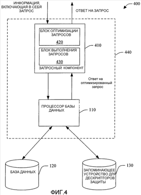 Переходя далее к фиг.4, отмечаем, что здесь изображена система 400, которая облегчает защищенный доступ к базе данных в соответствии с одним аспектом настоящего изобретения. Система 400 включает в себя процессор 110 базы данных, базу 120 данных, запоминающее устройство 130 для дескрипторов защиты и запросный компонент 410. Запросный компонент 410 может включать в себя блок 420 оптимизации запросов и блок 430 выполнения запросов. По выбору запросный компонент 410 может дополнительно включать в себя компонент 440 процессора базы данных запросов.