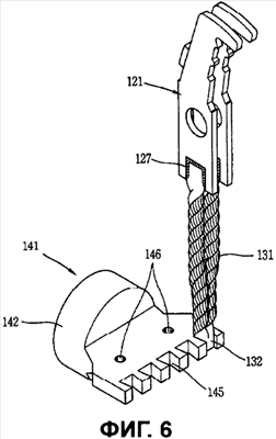В то же время соединитель 141 включает соединительную часть 142, соединенную со стороной электропитания или стороной нагрузки, и соединительную часть 145 для проводников, с которой соединены гибкие проводники 131. Соединительная часть 142 имеет форму круглого стержня, а соединительная часть 145 для проводников, имеющая форму относительно тонкой пластины, выполнена интегрально с соединительной частью 142 на одной стороне соединительной части 142. На одной концевой поверхности соединительной части 142 выполнено несколько сквозных соединительных отверстий 144 для соединения со стороной электропитания или стороной нагрузки с помощью фиксирующего болта или т.п.