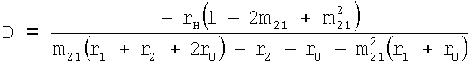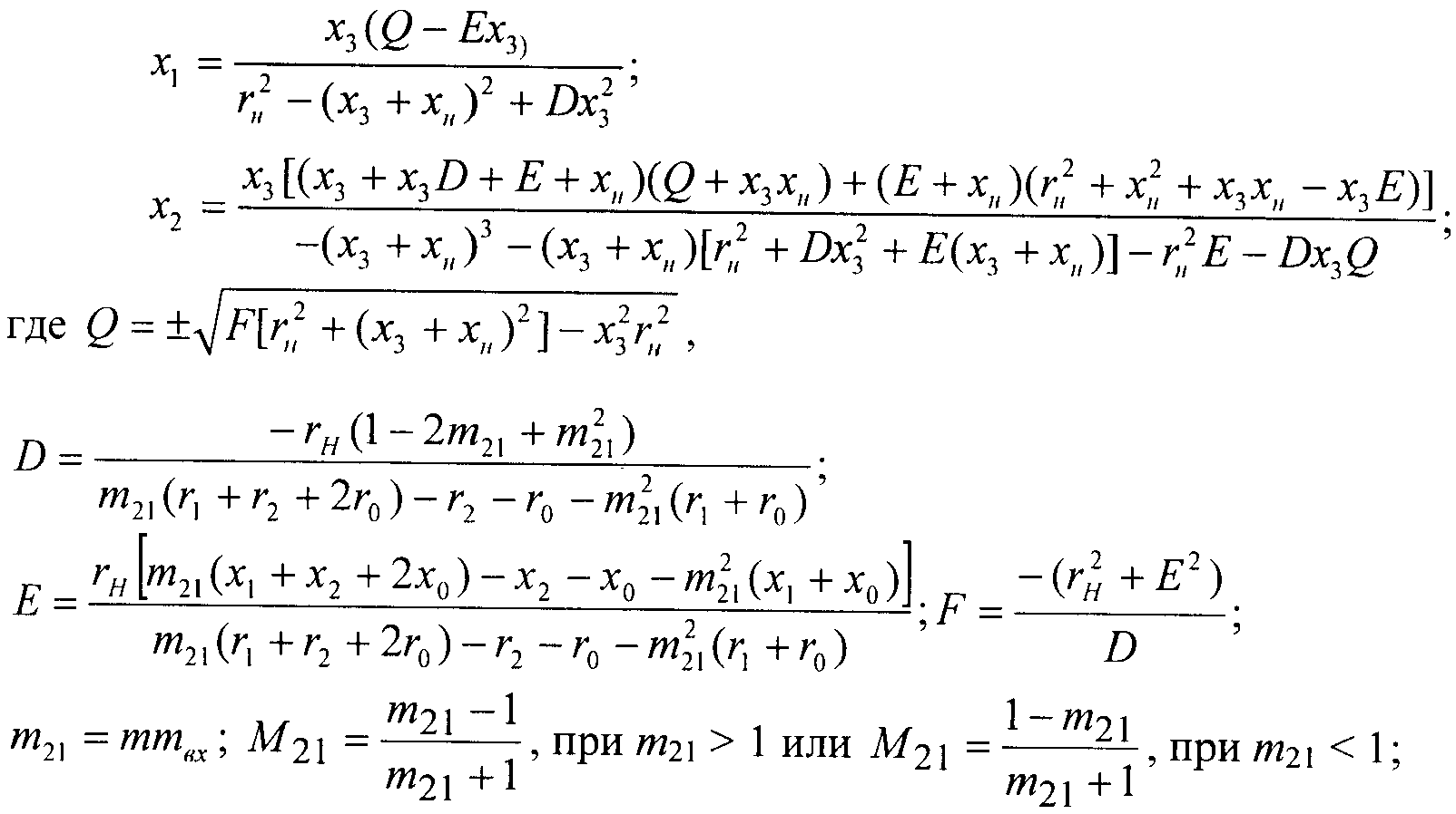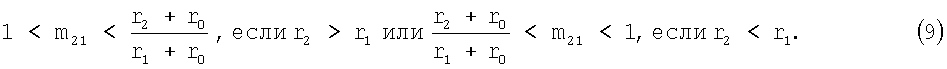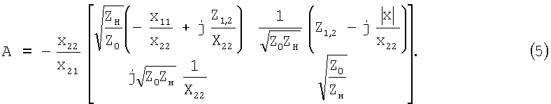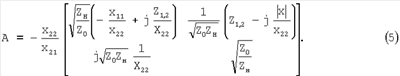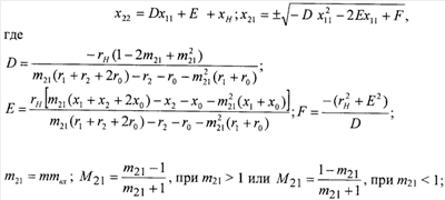 m, mвх, m21 – отношения модулей коэффициента передачи высокочастотной части демодулятора, входного сигнала и сигнала на высокочастотной нагрузке в двух состояниях входного сигнала, характеризуемых двумя крайними значениями амплитуды амплитудно-модулированного сигнала; М21 – глубина модуляции амплитудно-модулированного сигнала на высокочастотной нагрузке; z1,2=r1,2+jx1,2 – заданные значения сопротивлений управляемого двухполюсного элемента в двух состояниях (1 и 2), определяемых двумя крайними уровнями входного амплитудно-модулированного сигнала; zн=rн+jхн, z0=r0+jx0 – заданные комплексные сопротивления нагрузки и источника сигнала; х11,х21,х22 – значения элементов матрицы сопротивлений четырехполюсника, оптимальные по критерию обеспечения заданной глубины модуляции амплитудно-модулированного сигнала на высокочастотной нагрузке.