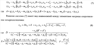 Для получения исходных для синтеза СФУ взаимосвязей между элементами матрицы сопротивлений (2), оптимальных по критерию обеспечения требуемого закона изменения амплитуды проходного сигнала, подставим (6) в (1). Получим систему двух уравнений в виде соответствующих равенств действительных и мнимых составляющих левой и правой частей (1), которые запишем в следующем виде: