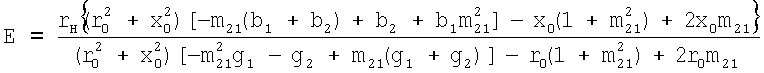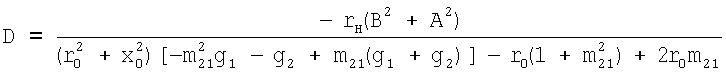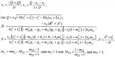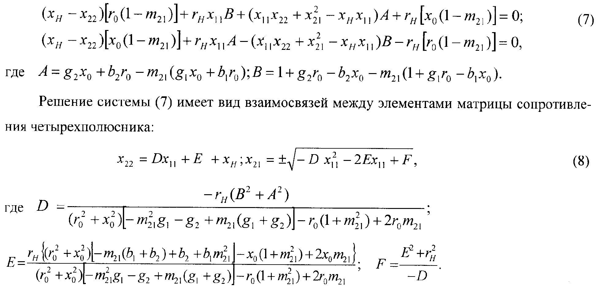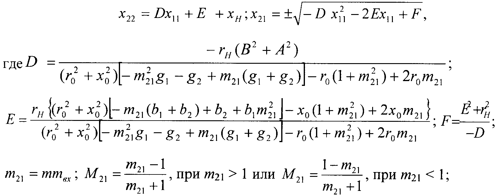 m, mвх, m21 – заданные отношения модулей коэффициента передачи высокочастотной части демодулятора, входного сигнала и сигнала на высокочастотной нагрузке в двух состояниях входного сигнала, характеризуемых двумя крайними значениями амплитуды амплитудно-модулированного сигнала; M21 – глубина модуляции амплитудно-модулированного сигнала на высокочастотной нагрузке; y1,2=g1,2+jb1,2 – заданные значения проводимостей управляемого двухполюсного элемента в двух состояниях (1 и 2), определяемых двумя крайними значениями амплитуды амплитудно-модулированного сигнала; zн=rн+jxн, zo=ro+jxo – заданные комплексные сопротивления нагрузки и источника сигнала; х11, х21, х22 – значения элементов матрицы сопротивлений четырехполюсника, оптимальные по критерию обеспечения заданной глубины модуляции амплитудно-модулированного сигнала на высокочастотной нагрузке.