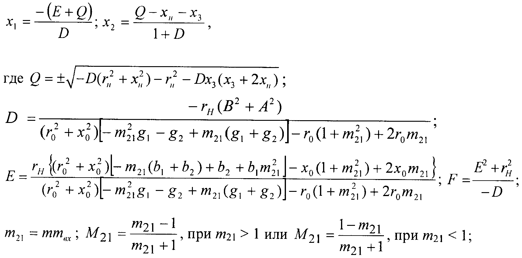 m, mвх, m21 – отношения модулей коэффициента передачи высокочастотной части демодулятора, входного сигнала и сигнала на высокочастотной нагрузке в двух состояниях входного сигнала, характеризуемых двумя крайними значениями амплитуды амплитудно-модулированного сигнала; М21 – глубина амплитудной модуляции амплитудно-модулированного сигнала на высокочастотной нагрузке; y1,2=g1,2+jb1,2 – заданные значения проводимостей управляемого двухполюсного элемента в двух состояниях (1 и 2), определяемых двумя крайними уровнями входного амплитудно-модулированного сигнала; zн=rн+jxн, z0=r0+jx0 – заданные комплексные сопротивления нагрузки и источника сигнала.