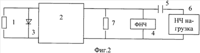 Высокочастотная часть структурной схемы обобщенного предлагаемого устройства по п.2 (фиг.2) состоит из каскадно-соединенных источника сигнала 1, резистивного четырехполюсника 2, двухполюсного нелинейного элемента 3, включенного между источником АМС и четырехполюсником в поперечную цепь (параллельно), и высокочастотной нагрузки 7. Низкочастотная часть структурной схемы содержит ФНЧ 4, разделительную емкость 5 и низкочастотную нагрузку 6.