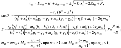; m21=mmвх; , при m21>1 или , при m21<1; m, mвx, m21 – заданные отношения модулей коэффициента передачи высокочастотной части демодулятора, входного сигнала и сигнала на высокочастотной нагрузке в двух состояниях входного сигнала, характеризуемых двумя крайними значениями амплитуды амплитудно-модулированного сигнала; M21 – глубина модуляции амплитудно-модулированного сигнала на высокочастотной нагрузке; y1,2=g1,2+jb1,2 – заданные значения проводимостей управляемого двухполюсного элемента в двух состояниях (1 и 2), определяемых двумя крайними значениями амплитуды амплитудно-модулированного сигнала; zн=rн+jxн, zo=ro+jxo – заданные комплексные сопротивления нагрузки и источника сигнала; x11, x21, x22 – значения элементов матрицы сопротивлений четырехполюсника, оптимальные по критерию обеспечения заданной глубины модуляции амплитудно-модулированного сигнала на высокочастотной нагрузке.