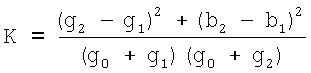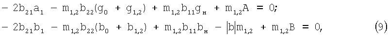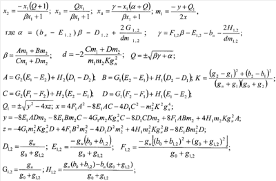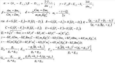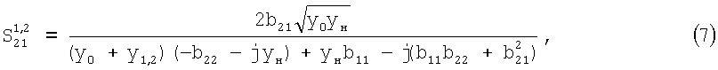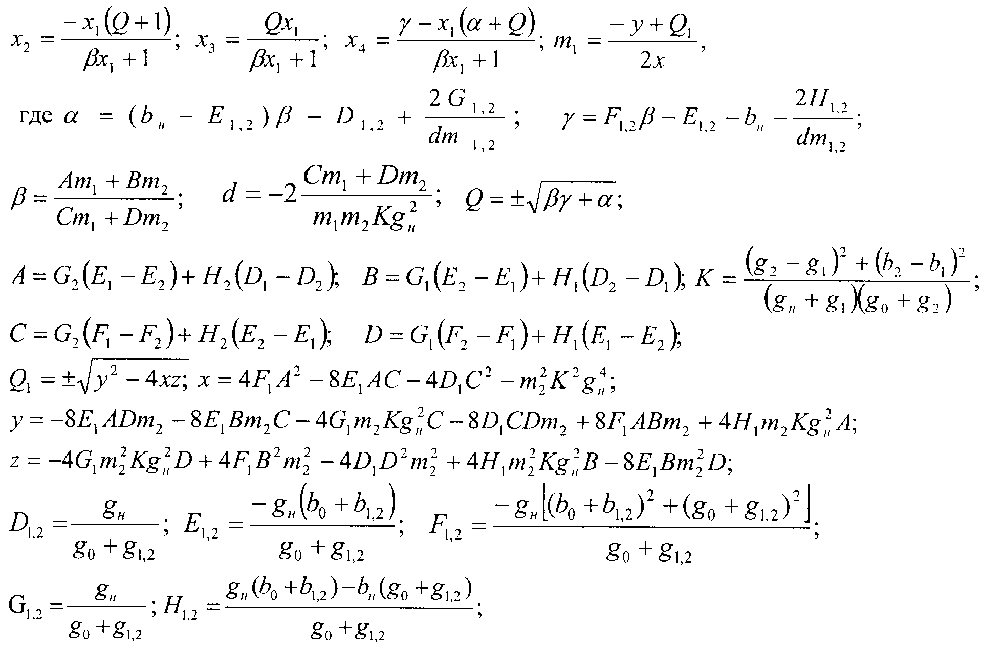 ; , , a, b, c, d – элементы классической матрицы передачи четырехполюсника; g0, b0 – заданные значения действительной и мнимой составляющих проводимости источника сигнала; gн, bн – заданные значения действительной и мнимой составляющей проводимости нагрузки; g1,2, b1,2 – заданные значения действительной и мнимой составляющих проводимости двухэлектродного управляемого элемента в двух состояниях, определяемых двумя уровнями амплитуды входного амплитудно-модулированного сигнала.
