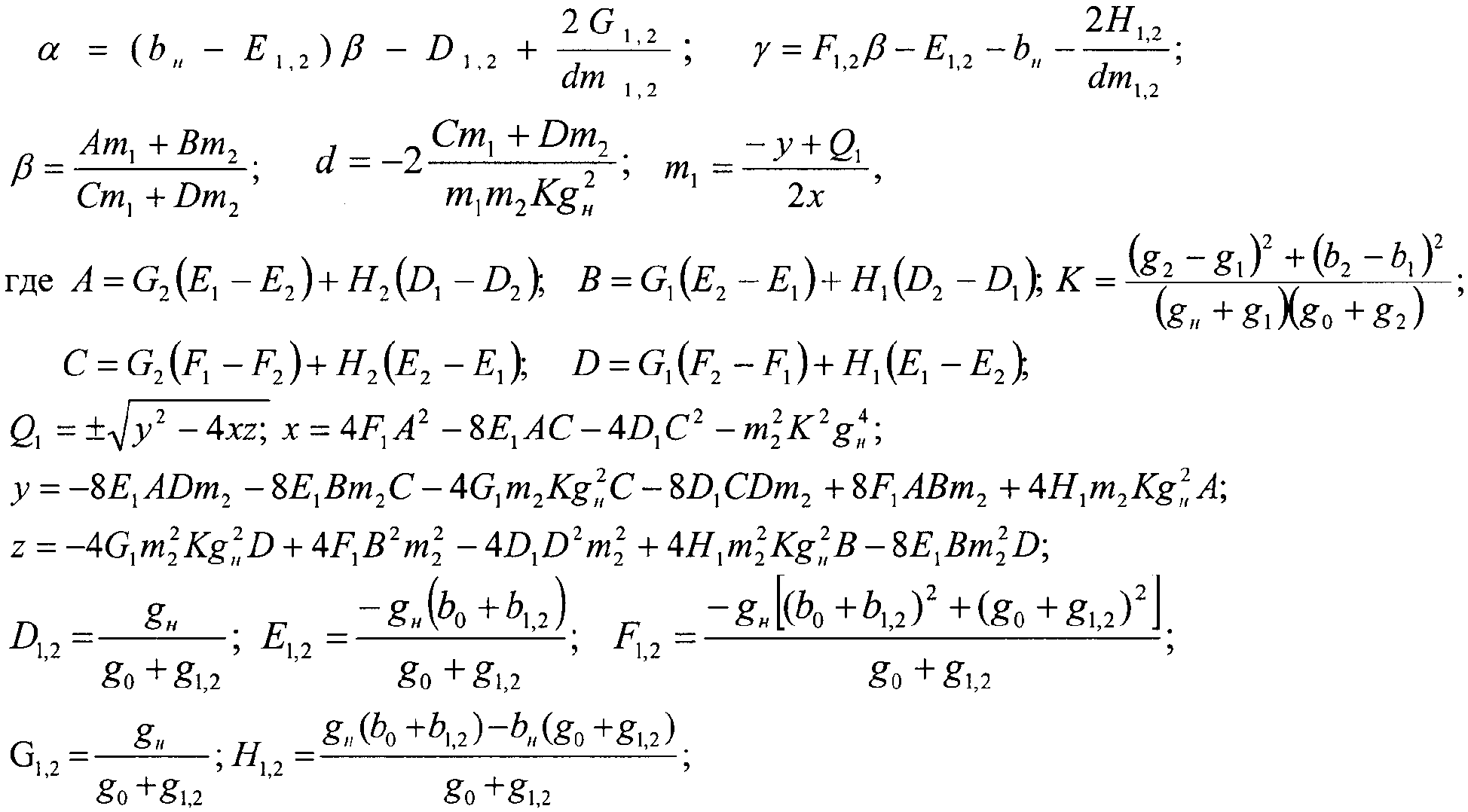 ; ; ; а, b, с, d – элементы классической матрицы передачи четырехполюсника; g0, b0 – заданные значения действительной и мнимой составляющих проводимости источника сигнала; gн, bн – заданные значения действительной и мнимой составляющей проводимости нагрузки; g1,2, b1,2 заданные значения действительной и мнимой составляющих проводимости двухэлектродного управляемого элемента в двух состояниях, определяемых двумя уровнями амплитуды входного амплитудно-модулированного сигнала.