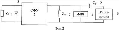 Принцип действия данного устройства состоит в том, что при подаче АМС от источника 1 с сопротивлением z0 (проводимостью у0) в результате специального выбора значений параметров классической матрицы передачи четырехполюсника 2 (значений сопротивлений двухполюсников) из условий обеспечения заданных значений модулей коэффициентов передачи демодулятора в двух состояниях нелинейного элемента, определяемых двумя крайними значениями уровней входного АМС, после прохождения его через высокочастотную часть достигается минимум искажений входного сигнала. В дальнейшем спектр АМС разрушается при помощи нелинейного элемента 3, ФНЧ 4 выделяет низкочастотную составляющую, постоянная составляющая устраняется с помощью разделительной емкости 5. В результате низкочастотное колебание, амплитуда которого изменяется по закону огибающей АМС, выделяется на низкочастотной нагрузке 6.