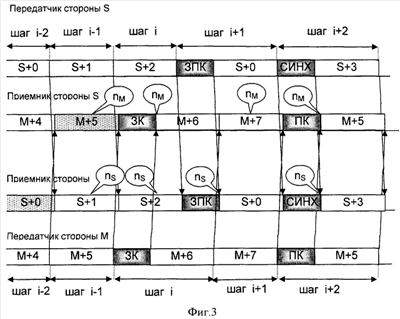 10. Если сторона М (фиг.2) после приема nS-го символа текущего кадра выделяет КТУ ПК, то это означает для нее факт приема стороной S КТУ ЗК и что далее на (i+2)-ом шаге стороной S будет передан повторяемый кадр S+0, переданный двумя шагами ранее. Аналогичные действия в такой ситуации выполняет и сторона S.