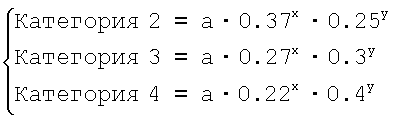 Математическим институтом им. Стеклова для получения многопараметрических регрессионных зависимостей рекомендованы степенные функции. Будем искать искомую регрессионную зависимость категории состояния лесного массива (k) от измеряемых параметров g (индекс зелености), r (индекс увядания), П – полота древостоя в виде: