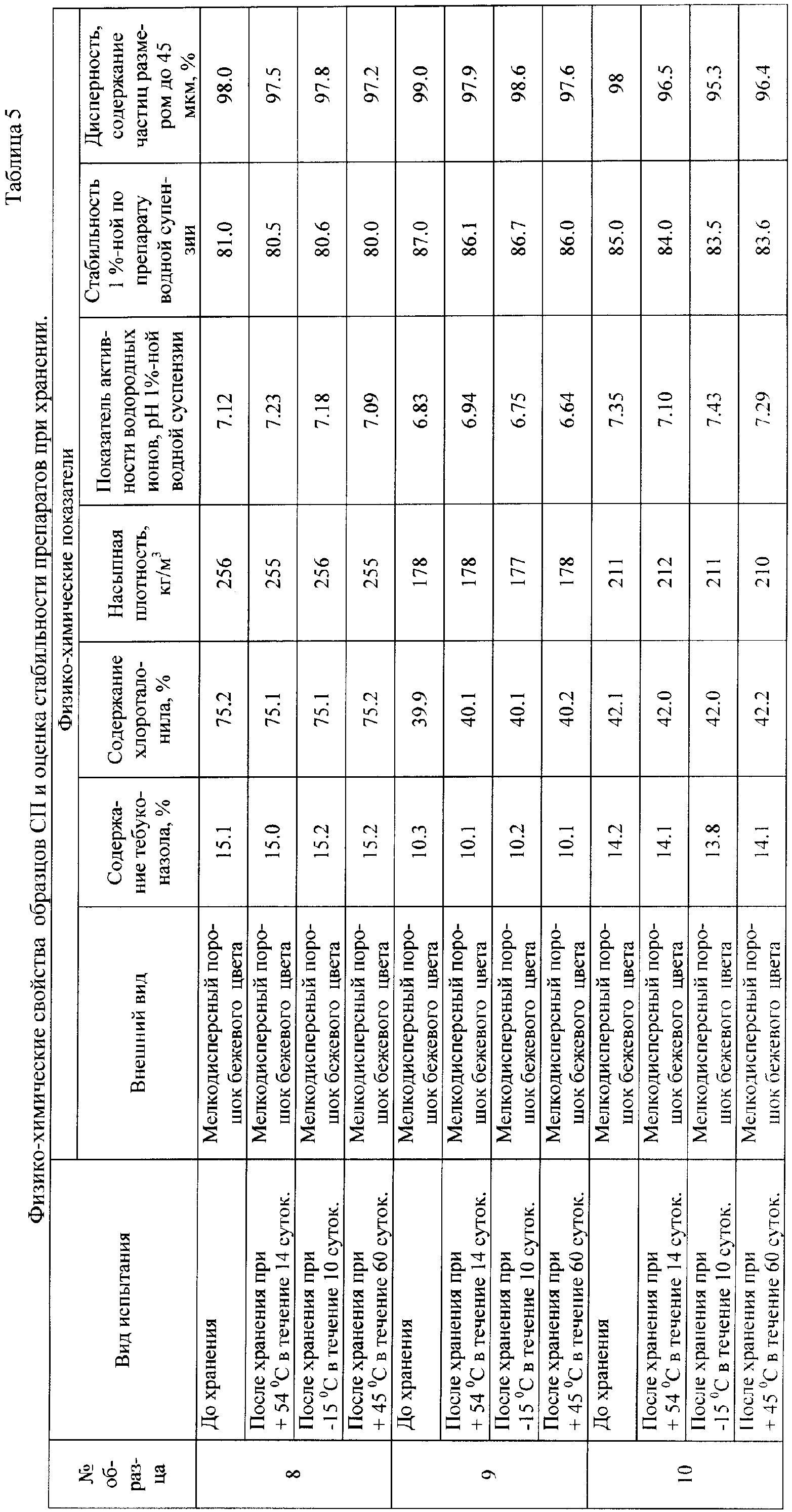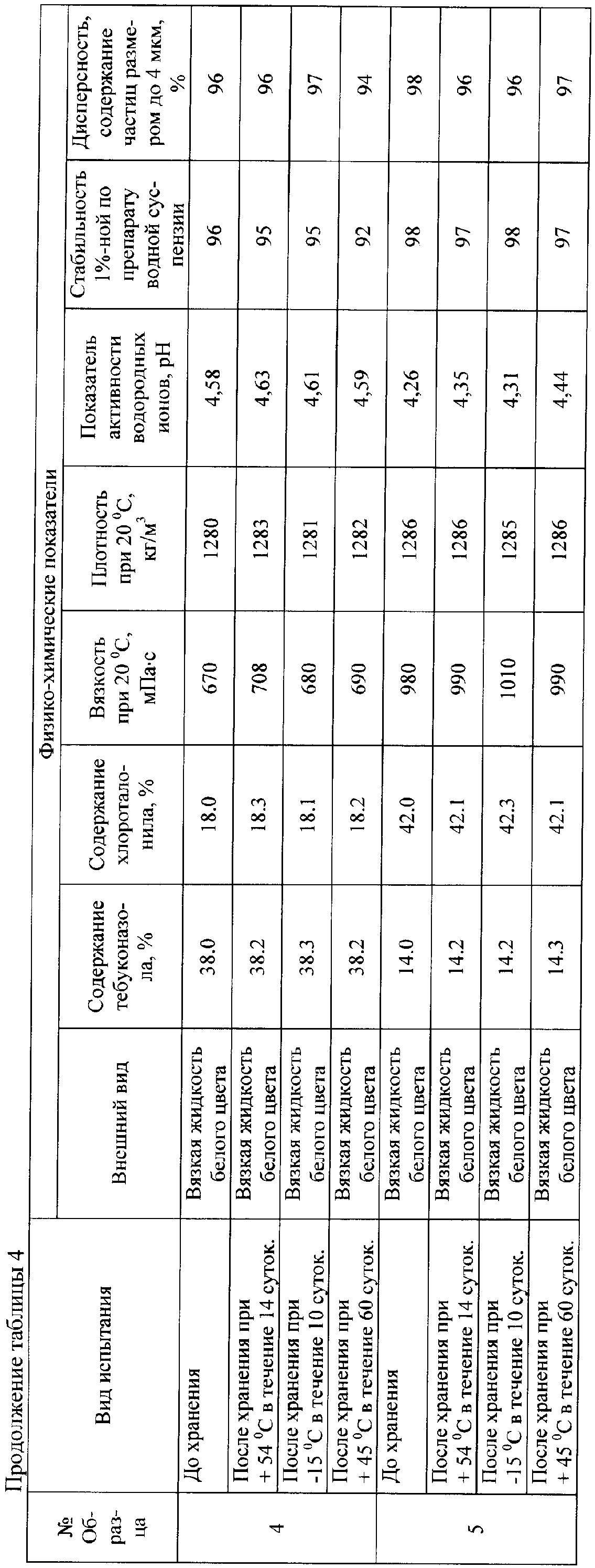 ПРИМЕР 4 Оценка стабильности различных видов препаративных форм при хранении. Для оценки возможности хранения препаратов в течение двух лет при температуре от минус 10 до плюс 35°С были проведены следующие тесты: 1. Тест на ускоренное хранение: препараты выдерживали в термостате при плюс 54°С в течение двух недель (методика CIPAC МТ 46); 2. Тест на морозостойкость: препараты выдерживали в термостате при температуре минус 15°С в течение 10 суток (ГОСТ 9.707-81 и Surfactants and Specialites for Plant Protection, Rhodia); 3. Тест на тепловое старение: препараты выдерживали в термостате при температуре плюс 45°С 60 суток (ГОСТ 9.707-81 и Surfactants and Specialites for Plant Protection, Rhodia) Повторность тестов – трехкратная. Вязкость препаратов как до, так и после хранения определяли на вискозиметре Брукфильда, стабильность определяли по ГОСТ 16484-79 и методике CIPAC МТ 161, дисперсность определяли на лазерном анализаторе частиц Fritsch Analysette 22. Результаты представлены в таблицах 4, 5, 6. Как видно из таблиц, все составы препаративных форм являются стабильными и могут храниться в течение двух лет при температуре от минус 10 до плюс 35°С. Оценка биологической активности композиций Лабораторные опыты В лабораторных опытах использовались чистые культуры патогенов (Alternaria tenius, Bipolaris sorokiniana), вызывающих «черный зародыш» зерновки; токсикогенных патогенов (продуценты микотоксинов), поражающих колос и зерновку (Fusarium moniliforme, Fusarium graminearum). Для определения спектра действия и эффективности действия ЭД90 тебуконазола, хлороталонила и смесей тебуконазола и хлороталонила на поверхности застывшей питательной среды с введенным в нее препаратом, производили точечный посев фитопатогенных грибов. После выдерживания в термостате в течение трех суток учитывали линейный рост (диаметр) колоний грибов или бактерий. По этому показателю сравнивали рост колоний в контроле (без введения препарата) и на среде с введенным в нее препаратом. Торможение роста колоний рассчитывали по формуле Эббота (James B.Sinclair, Onkar Dev Dhingra, Basic Plant Pathology Methods, 2nd Edition, CRC-Press, 1995, 448 pages):