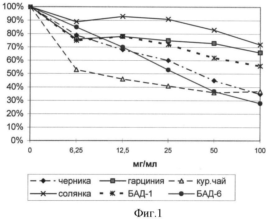 На фиг.1 показано влияние растительных экстрактов и композиций БАД на перекисное окисление липидов в митохондриях, вызванное бутилгидроксипероксидом (1,6 мМ). (БАД-1 – Композиция I – Коррекция веса, БАД-6 – Композиция II – Очищающая.).