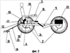 Управляют инвалидной коляской с пульта 21. От пульта 21 сигнал идет на электросхему (на чертежах не показана), которая обеспечивает подачу электропитания на мотор-колеса и другие механизмы коляски. В начале движения коляски или при изменении характера ее движения (вверх, вниз или по горизонтальной поверхности) с помощью рычага 20 выводят из контакта тормоза 19 и тормозные диски 18. Штанга 5 стабилизатора горизонтального положения под действием груза 4 принимает вертикальное положение, а сиденье 3 – горизонтальное. Это положение поднятием рычага 20 фиксируется, что обеспечивает сохранение горизонтального положения сиденья 3. При этом сыпучий груз находится в нижней части тороидальной емкости 7, снижая центр тяжести коляски и повышая ее устойчивость. Поворот в движении осуществляют снижением скорости колеса 2, расположенного на стороне, в которую делается поворот.