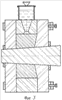 На фиг.2 показано устройство для формования питательного кольца со сквозным отверстием диаметром 40 мм из кварцевой керамики. Оно включает сборную гипсовую форму 1, металлический сердечник 2 с конусностью не менее 0,5°, прибыльную емкость 3, литниковую воронку в одном из элементов гипсовой формы 4, струбцины для стяжки элементов гипсовой формы 5. Для предотвращения набора керамики на гипсовой литниковой воронке 4 ее поверхность герметизируют шеллаком или другим влагонепроницаемым материалом. Наружную поверхность сердечника желательно полировать и смазать солидолом. Фиксация сердечника осуществляется посредством концевых эластичных ограничителей, выполненных, например, из резины. Они одновременно служат для предотвращения протекания шликера между сердечником и гипсовой формой. Стыки сердечника с формой с наружной стороны формы можно герметизировать пластилином.