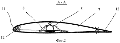 На фиг.1 изображена схема лопасти, вид сверху.