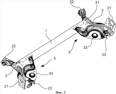 На фиг.3 показано, что такая гибкая ось содержит траверсу 1, соединяющую два продольных кронштейна 2, каждый из которых поддерживает: