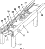 На фиг.6 погрузочно-разгрузочное устройство показано в увеличенном масштабе. Это погрузочно-разгрузочное устройство состоит из стоящего на опорных стойках 25 каркаса 21, предназначенного для направленного перемещения салазок 22. Салазки 22 могут приводиться в движение двигателем 23 через соответствующую зубчатую рейку на салазках 22. Однако для приведения салазок в движение можно также использовать приводы иного типа, например цепные или иные аналогичные приводы. Внутри салазки 22 имеют аналогичную подкрановому пути направляющую 24 охватывающего типа, по которой каретка 30 может перемещаться на колесах 37. Каретка состоит из продольных балок 35 и поперечных балок 38, на которых закреплено два приводных узла 32 для передачи вращения на колеса 37 каретки, управление перемещением которой может тем самым осуществляться независимо и в качестве двигателей которой предпочтительно использовать гидродвигатель, подсоединенный к соответствующей гидросистеме 34. Гидросистема одновременно используется также для попеременного или же по мере необходимости также для одновременного выдвижения телескопических штоков 31 на обоих концах каретки.
