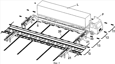 На фиг.5 схематично в аксонометрии показана перегрузочная площадка грузоперевалочного терминала или грузоперевалочной станции с грузом L, доставленным автомобилем F на погрузочный путь и помещенным при этом на сменный поддон 5. Вследствие этого подъездной путь 11 свободен. Между рельсовым путем G и погрузочным путем 12 рядом с передним и задним концами сменного поддона 5 расположено по погрузочно-разгрузочному устройству 21 с кареткой 30, а по другую сторону рельсового пути расположено погрузочно-разгрузочное устройство 21′ без каретки. Сменный поддон может перемещаться каретками 30 по направляющим дорожкам 20 с погрузочного пути на перегрузочный путь 13, соответственно далее в направлении к рельсовому пути G. В показанном на чертеже примере рельсовый путь представляет собой путь с рельсами на Y-образных шпалах и расположен несколько ниже уровня направляющих дорожек 20, находящихся на примыкающих к нему платформах.