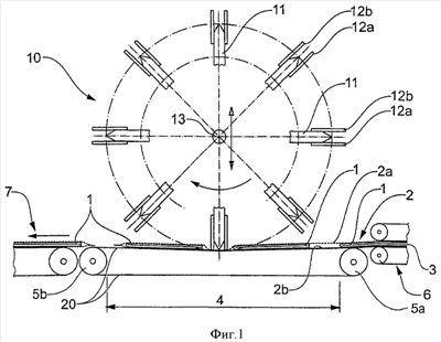 13. Устройство по п.11, в состав которого входит несущая лента (20) для транспортировки конвейерного потока (3) в область технологической обработки, и получения силы, противодействующей силам действия прижимных средств (12а, 12b) и средств технологической обработки (11) на конвейерный поток (3).