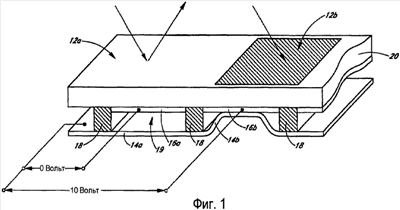 При отсутствии приложенного напряжения полость 19 между слоями 14а, 16а сохраняется, а деформируемый слой находится в механически ненапряженном состоянии, что иллюстрируется пикселем 12а на фиг.1. Вместе с тем, когда к выбранным строке и столбцу приложена разность потенциалов, конденсатор, образованный на пересечении электродов строки и столбца в соответствующем пикселе, становится заряженным, и электростатические силы притягивают электроды друг к другу. Если напряжение является достаточно высоким, подвижный слой деформируется и принудительно подводится к неподвижному слою (на неподвижном слое можно осадить диэлектрический материал, который не показан на этом чертеже, чтобы предотвратить короткое замыкание и управлять разделительным расстоянием), что иллюстрируется пикселем 12b справа на фиг.1. Это поведение оказывается тем же самым безотносительно полярности приложенной разности потенциалов. Таким образом, возбуждение строки и столбца, которое может обеспечить управление отражающими и неотражающими состояниями пикселей, оказывается во многом аналогичным тому, которое используется в технологиях производства обычных жидкокристаллических (ЖКД) и других дисплеев.