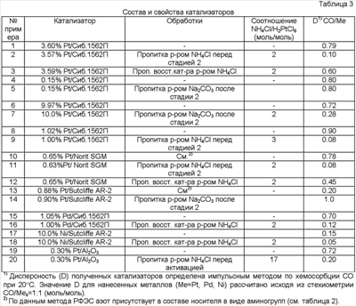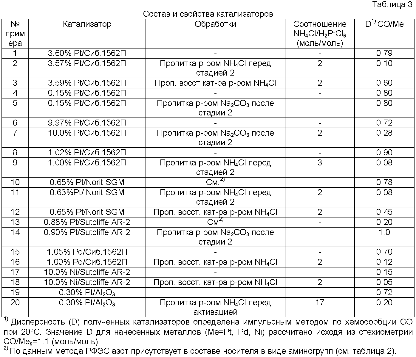 Данные по дисперсности частиц платины в катализаторах, приготовленных в соответствии с приведенными в настоящем патенте примерами, представлены в таблице 3.