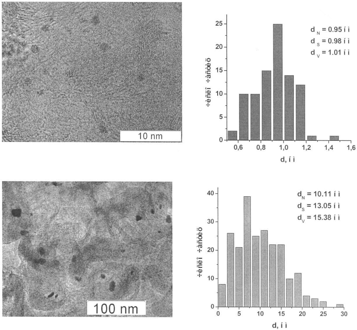 На Фиг.1 представлено элекронно-микроскопические изображения и гистограммы распределения по размерам у частиц металлов для катализаторов 1.0% Pt/Сиб.1562П, приготовленных по примерам 10 (сверху) и 11 (снизу). Обозначения: dN, dS и dV – среднечисленный, среднеповерхностный и среднемассовый размеры частиц, вычисленные из гистограмм.