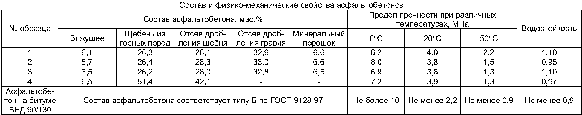 Изобретение относится к составам модифицированных асфальтобетонных смесей на основе битумно-резиновых композиций (БРК) и может быть использовано при производстве асфальтобетонов, используемых при устройстве покрытий автомобильных дорог, аэродромов и т.п. Асфальтобетонная смесь содержит вяжущее – битумно-резиновую композицию, полученную из битума и крошки из вулканизированной резины из отработанных автомобильных шин, обработанную до полной диссоциации частиц резины в композиции, и минеральный наполнитель. Указанная крошка вулканизированной резины имеет размер частиц 2-10 мм. Композиция дополнительно содержит нафталиновую фракцию каменноугольной смолы, температура кипения компонентов которой 200°С и выше, при соотношении компонентов композиции, мас.%: битум 60-85, указанная крошка из вулканизированной резины 10-30, указанная нафталиновая фракция каменноугольной смолы 5-10. Соотношение компонентов в асфальтобетонной смеси составляет, мас.%: битумно-резиновая композиция 5-10, минеральный наполнитель – остальное. Технический результат: улучшение эксплуатационных характеристик получаемых асфальтобетонных смесей, утилизация амортизированных резиновых изделий и отходов их производства. 1 табл.