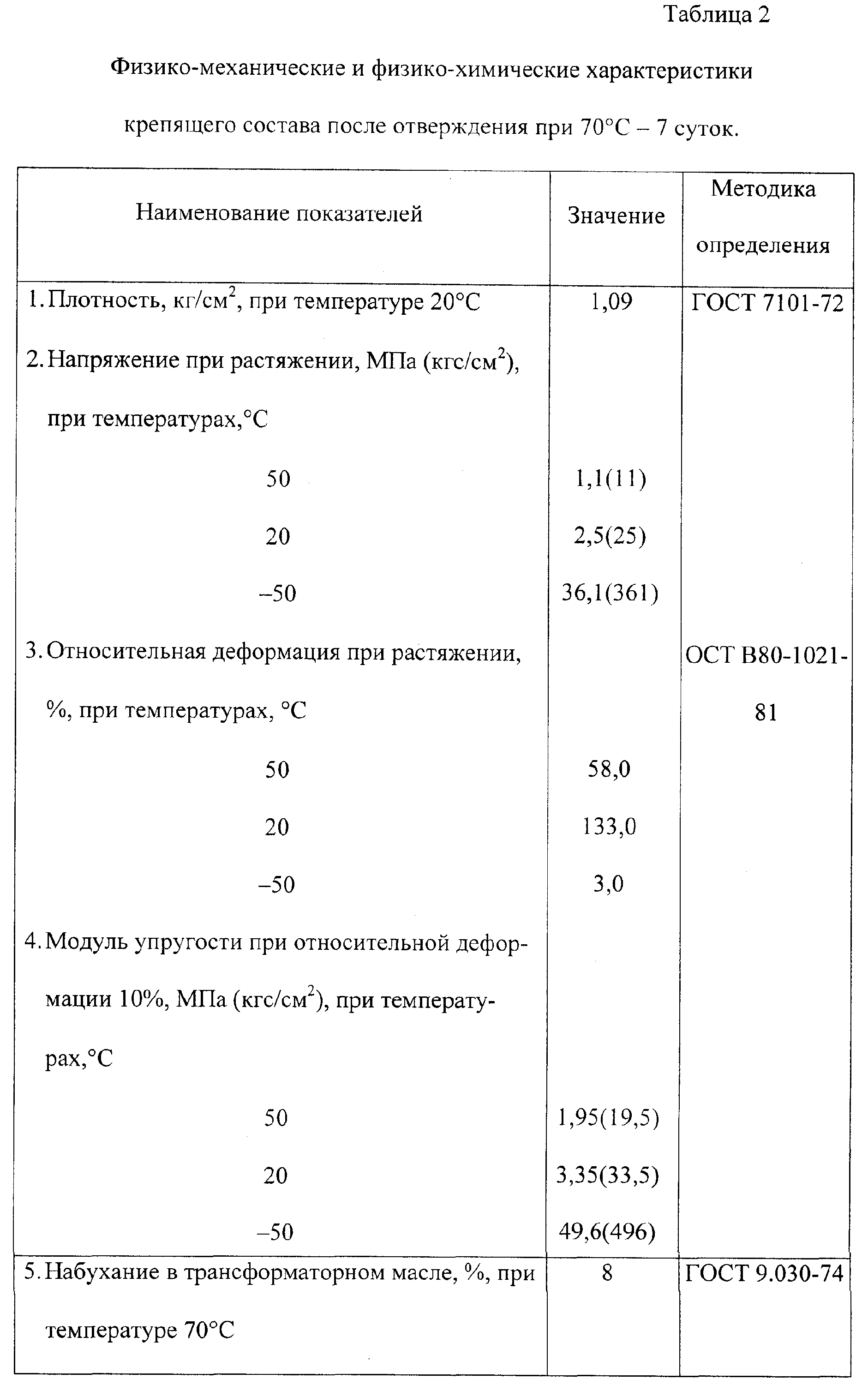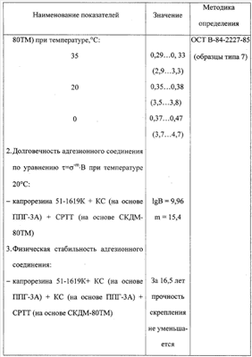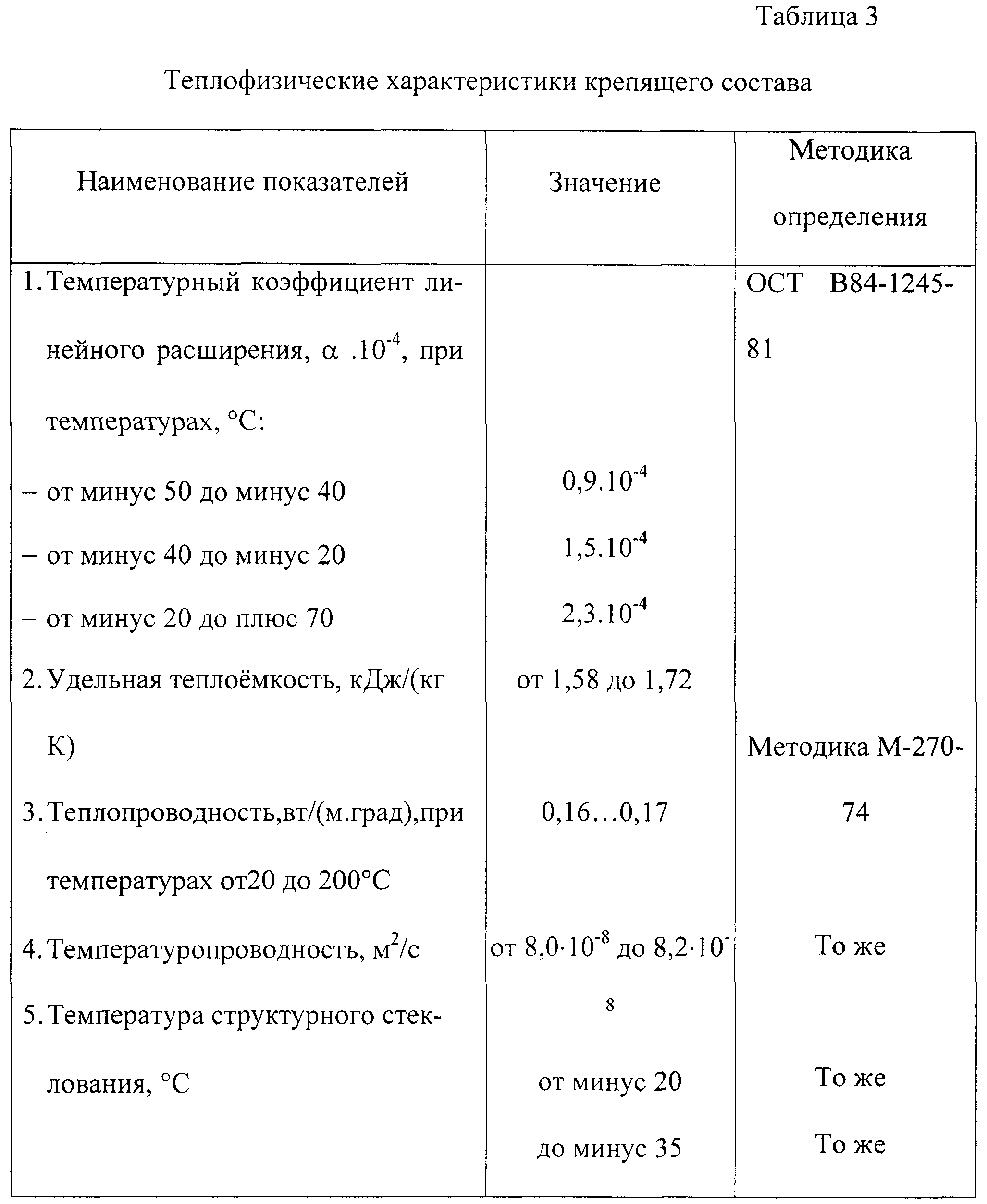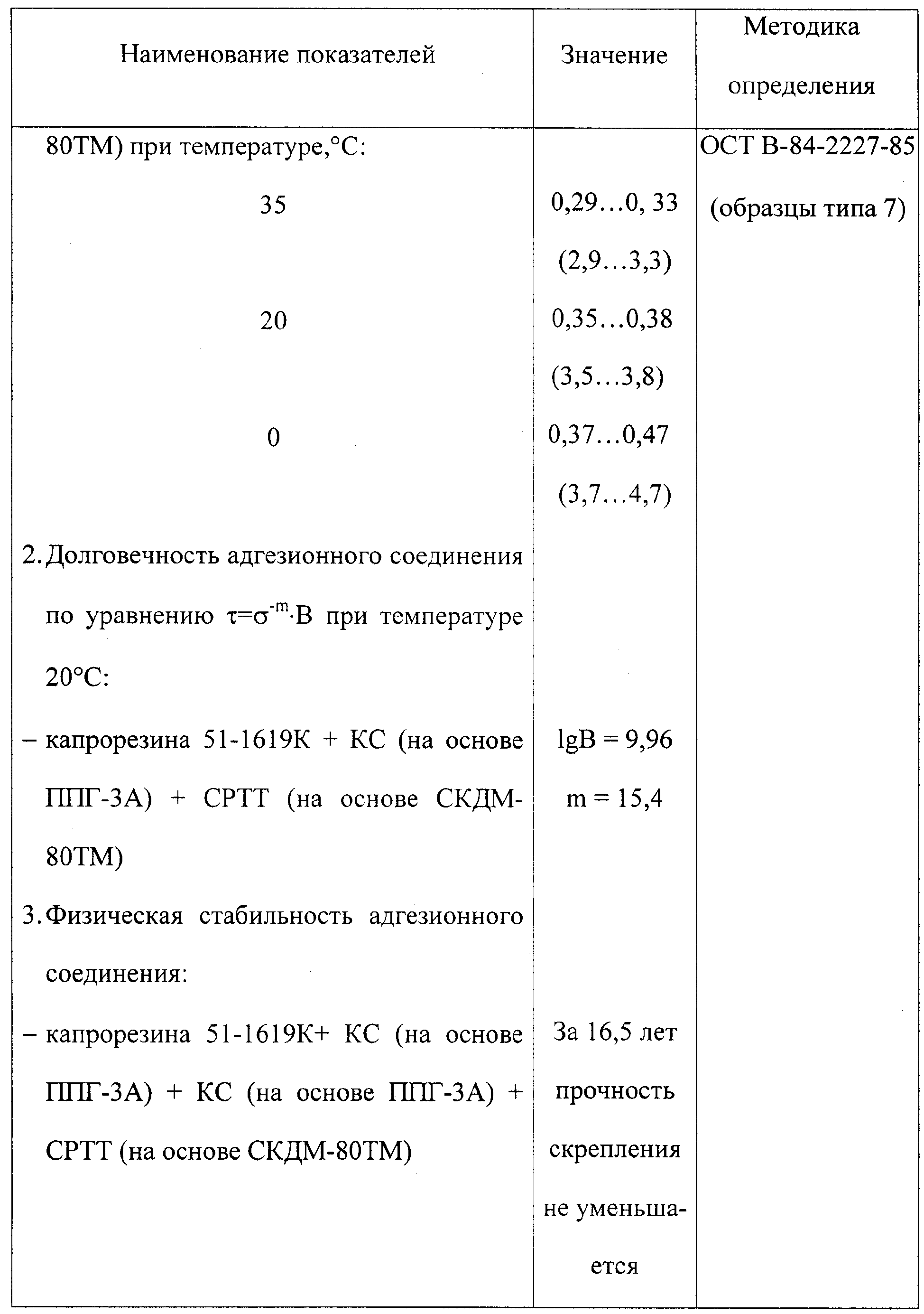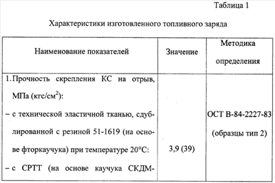 Изобретение относится к области разработки технологии изготовления прочноскрепленного с корпусом ракетного двигателя (РД) заряда смесевого ракетного твердого топлива (СРТТ). Среди большого количества ракетных зарядов из СРТТ важное место занимают заряды из высокоэнергетических СРТТ, которые используются в крупногабаритных ракетных двигателях. А в крупногабаритных РД заряды, как правило, являются прочноскрепленными с корпусом двигателя. Одним из вариантов смесевого ракетного твердого топлива для таких зарядов, наиболее полно выполняющим требования к таким РД, является топливо, связующее которого изготавливается на основе маслонаполненного полибутадиенового каучука СКДМ-80ТМ. В таком топливе содержится также перхлорат аммония, порошок алюминия, октоген, пластификаторы, отвердители, добавки, регулирующие скорость горения, и другие компоненты. Отверждение топлива проводится при температуре, обеспечивающей взаимодействие отвердителей с каучуком СКДМ-80ТМ и другими компонентами, но не выше 70°С, в течение нескольких суток. Изготовление зарядов из таких топлив проводится по способу, описанному в патенте на изобретение Недостатками этого способа изготовления прочноскрепленного с корпусом ракетного двигателя заряда смесевого ракетного твердого топлива являются недостаточная для некоторых конструкций ракетных двигателей и условий эксплуатации прочность скрепления топлив, содержащих октоген, с корпусом РД при использовании указанного в прототипе крепящего состава, ограниченный ресурс химической совместимости СРТТ и крепящего состава и стабильности свойств в зоне скрепления, лимитирующих гарантийные сроки эксплуатации РДТТ. Технической задачей изобретения является разработка такого варианта технологического процесса изготовления прочноскрепленного с корпусом заряда СРТТ, который позволяет обеспечить высокую, не ниже прочности топлива, адгезионную прочность, улучшить химическую совместимость и стабильность свойств в зоне скрепления, получать требуемые длительные гарантийные сроки эксплуатации зарядов, а также повысить безопасность проведения работ за счет сведения до минимума содержания легколетучего растворителя в крепящем составе. Указанная цель была достигнута при изготовлении заряда СРТТ по способу, включающему подготовку компонентов, входящих в топливо, смешение минеральных и металлических порошкообразных компонентов (перхлората аммония, октогена, алюминия) со связующим на основе маслонаполненного полибутадиенового каучука марки СКДМ-80ТМ, дополнительную пластификацию трансформаторным маслом и нитрилом олеиновой кислоты, ввод отвердителей и других добавок, окончательное смешение топливной массы, нанесение на внутреннюю поверхность РД, представляющую собой теплозащитное покрытие корпуса, дублированного тканью, для скрепления с топливом крепящего состава и вулканизующей добавки, отличающемуся тем, что в качестве крепящего состава и вулканизующей добавки используются следующие рецептуры (мас.%): крепящий состав: – каучук полиэфируретановый с концевыми эпоксиуретановыми группами ППГ-3А – 30 – олигоэфирэпоксид марки Лапроксид 703 – 20 – смола эпоксидная ЭД-20 – 17 – ангидрид изометилтетрагидрофталевый – 19 – диметилбензиламин – 0,2 – эфир хиноловый марки ЭХ-1 – 1,5 – этилацетат – 4 – эф