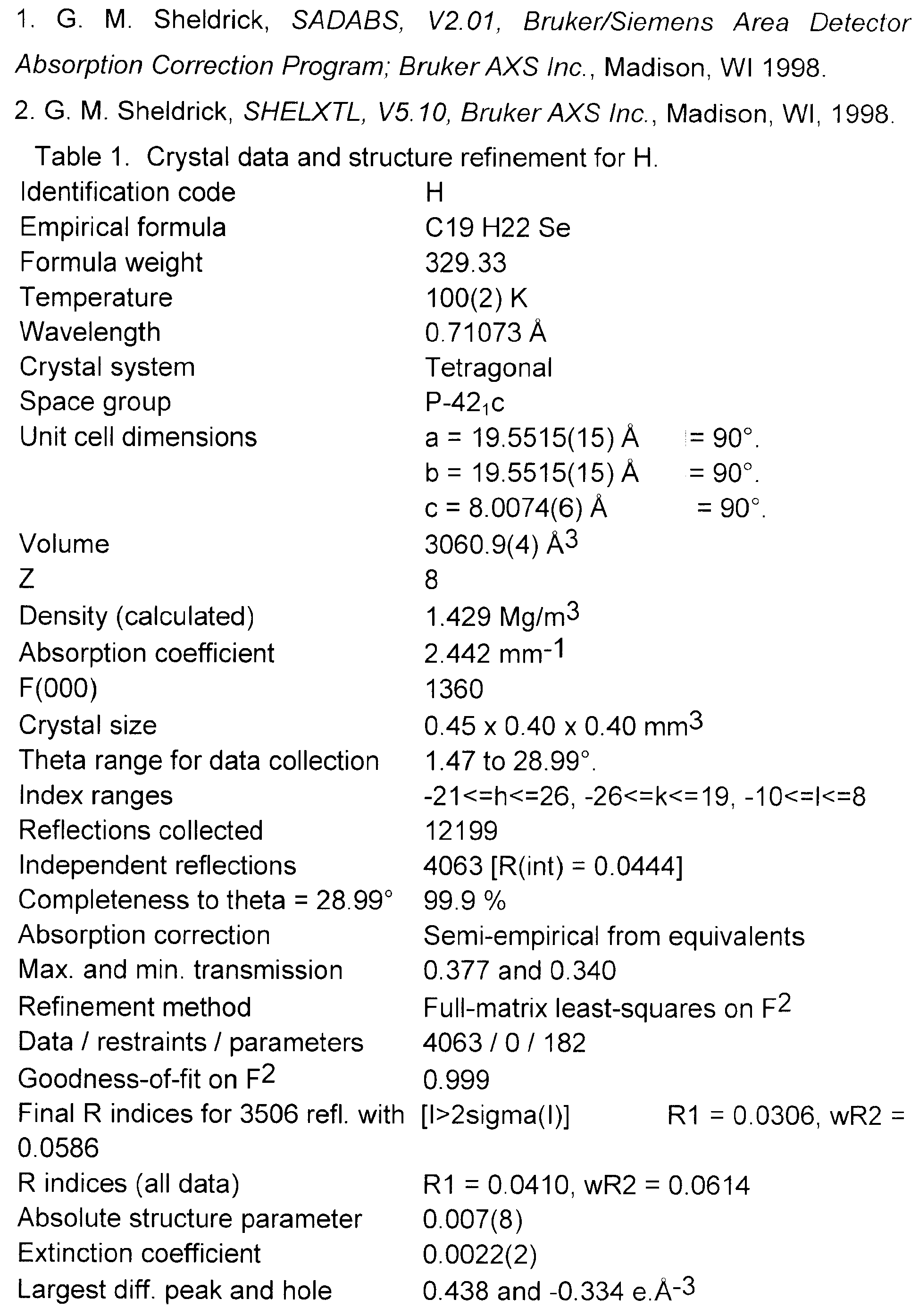 Рентгеноструктурное исследование. Кристалл соединения Н (C19H22Se1, М=329.33), тетрагональный, пространственная группа Р-421c, при Т=100 К а=b=19.5515(15) , с=8.0074(6) , V=3060.9(4) 3, Z(Z’)=8(1), F(000)=1360, dcalc=1.429 г см-3, µ=24.42 мм-1. Интенсивности 12199 отражений измерены на автоматическом дифрактометре «Bruker SMART APEX II CCD» (Т=100 К, Мо-К -излучение, графитовый монохроматор, – и -сканирование, max=58°) и дальнейшие расчеты проводили по 4063 независимым отражениям (Rint=0.0444). Учет поглощения рентгеновского излучения проводили по программе SADABS1. Структура определена прямым методом и уточнена полноматричным методом наименьших квадратов в анизотропном приближении для неводородных атомов. Положения атомов водорода рассчитаны геометрически и все они уточнены в изотропном приближении с фиксированными позиционными (модель «наездника») и тепловыми параметрами. Окончательные факторы расходимости равны R1=0.0306 для 3506 независимых отражений с I>2 (I) и wR2=0.0614 и GOF=0.999 для всех независимых отражений. Все расчеты проведены с использованием комплекса программ SHELXTL PLUS (Version 5.10)2.
