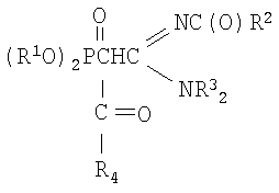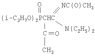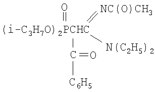 К раствору натриевого производного, приготовленного из 1.96 г (0.0061 моль) N,N-диэтил-N’-ацетил-(диизопропоксифосфорил)ацетамидина и 0.141 г (0.0061 моль) натрия (по методике из примера 1) в диоксане (5 мл), при перемешивании и температуре 20÷30°С добавляют по каплям 0.48 г (0.0061 моль) хлористого ацетила в 5 мл абсолютного диоксана. Реакционную массу перемешивают в течение 3 часов при 50°С. Соль хлорида натрия отделяют фильтрацией, растворитель удаляют отгонкой в вакууме (при 15-20 гПа), остаток вакуумируют в течение 1 часа при 50°С и 2-4 гПа. Получают 1.63 г N,N-диэтил-N’-ацетил-(ацетилдиизопропоксифосфорил)этанамидина. Выход 84%. nD C16H31O5N2P. Вычислено, %: N 7.73, Р 8.56. Спектр ЯМР 1H (CCl4), м.д.: 1.13 т (6Н, СН3); 1.25 д (12Н, СН3); 1.89 с (3Н, СН3С(О)); 1.97 с (3Н, СН3С(О)); 2.77 д (1Н, СНР); 3.25 к (4Н, NCH2); 4.65 м (2Н, CHOP); ИК-спектр, Пример 5 N,N-диэтил-N’-ацетил-(бензоилдиизопропоксифосфорил)этанамидин