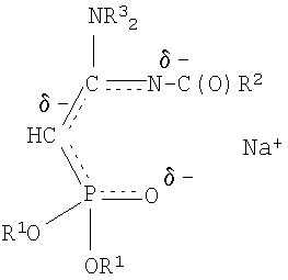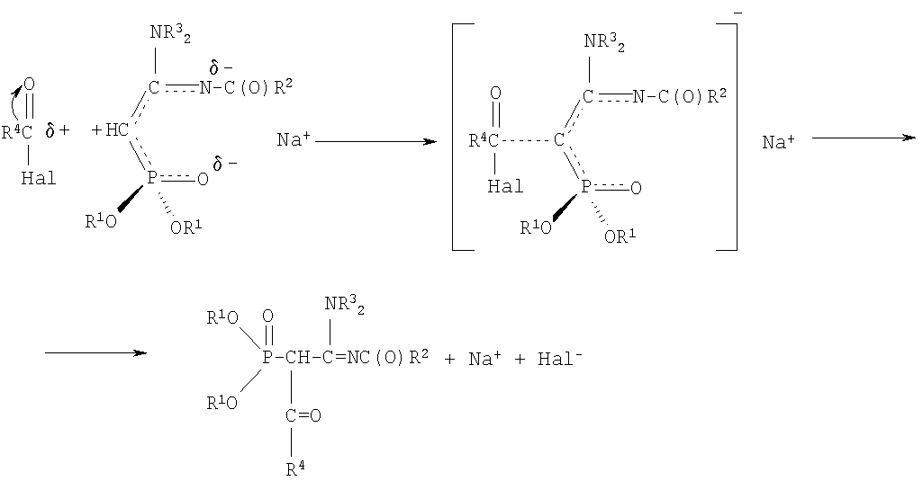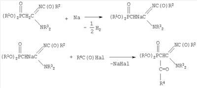 где R1=С3-С4– алкил или изоалкил; R2=СН3, С6Н5; R3=С2-С3 – алкил; R4=СН3, С6H5; заключающийся в получении натриевых производных С-фосфорилированных ацетамидинов путем взаимодействия С-фосфорилированных ацетамидинов с натрием с последующим ацилированием полученного натриевого производного галогенангидридами кислот, такими как бромистый или хлористый ацетил и хлористый бензоил, в среде диоксана при мольном соотношении натрий: С-фосфорилированный ацетамидин: галогенангидрид = 1:1:1÷1.1 соответственно и температуре 20÷50°С. Химическая схема предложенного способа получения N,N-диалкил,N’-ацил-(ацилдиалкоксифосфорил)этанамидинов: Реакции ацилирования сводятся к нуклеофильному замещению галогена в молекуле галогенангидрида, причем в качестве нуклеофильного реагента выступает анион СН-кислотного соединения. На основании изучения литературных данных можно утверждать, что реакция ацилирования натриевых производных С-фосфорилированных ацетамидинов протекает по механизму SN2. В галогенангидридах кислот на атоме углерода карбонильной группы имеется большой дефицит электронной плотности, обусловленный электроноакцепторным воздействием атома кислорода и атома галогена. Анион натриевого производного амидина можно рассматривать как амбидентный анион, в котором местом с наибольшей нуклеофильной реакционной способностью является атом углерода метиновой группы, а местом наибольшей электронной плотности – атом кислорода фосфорильной группы и атом азота иминогруппы. Принимая во внимание все вышесказанное, механизм взаимодействия галогенангидридов с Na-производными С-фосфорилированных ацетамидинов можно представить следующим образом: При выборе растворителя для проведения реакций ацилирования следует принять во внимание, что при использовании неполярных или малополярных растворителей натриевое производное существует в виде ионных пар, причем ион натрия координируется по местам с наибольшей электронной плотностью. Натриевому производному С-фосфорилированного ацетамидина правильнее приписывать структуру, согласно которой ион натрия координирован одновременно по атому кислорода фосфорильной группы и атому азота иминогруппы – местам с наибольшей электронной плотностью, а не по какому-либо одному из них или по атому углерода: