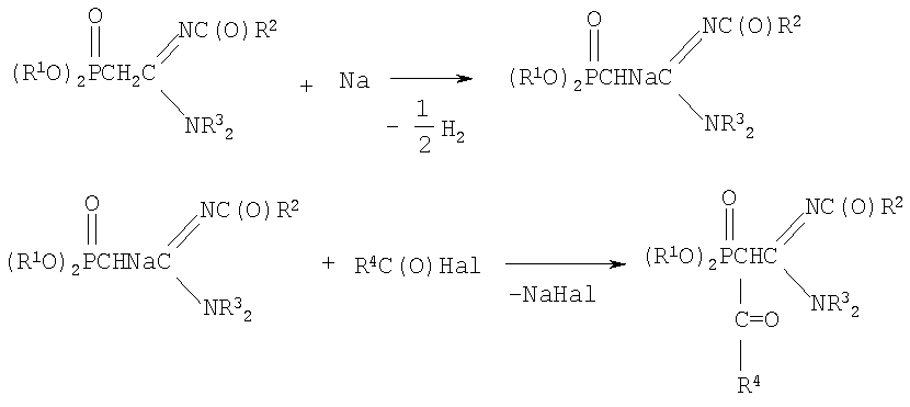 К раствору натриевого производного, приготовленного из 2.08 г (0.0065 моль) N,N-диэтил-N’-ацетил-(дибутоксифосфорил)ацетамидина и 0.15 г (0.0065 моль) натрия (по методике из примера 1) в диоксане (4 мл), при перемешивании и температуре 20÷30°С добавляют по каплям 0.91 г (0.0065 моль) хлористого бензоила в 2 мл диоксана. Реакционную массу перемешивают в течение 6 часов при 50°С. Соль хлорида натрия отделяют фильтрацией, растворитель удаляют отгонкой в вакууме (при 15-20 гПа), остаток вакуумируют в течение 1 часа при 50°С и 2-4 гПа. Получают 2.5 г N,N-диэтил-N’-ацетил-(бензоилдиизопропоксифосфорил)этанамидина. Выход 80%. nD Спектр ЯМР 1Н (ССl4), м.д.: 1.12 т (6Н, СН3); 1.24 д (12Н, СН3); 1.96 с (3Н, СН3С(О)); 2.80 д (1Н,СНР); 3.23 к (4Н,NСН2); 4.67 м (2Н, РОСН); 7.35 м (5Н, С6Н5); ИК-спектр, Предложенный метод заключается во взаимодействии С-фосфорилированных ацетамидинов с натрием с образованием натриевых производных, которые не выделяются из реакционной смеси, а подвергаются сразу же ацилированию с образованием N,N-диалкил,N’-ацил-(ацилдиалкоксифосфорил)этанамидинов, что оказалось возможным вследствие высоких СН-кислотных свойств активированной метиленовой группы исходных ацетамидинов. Достоинством разработанного метода является простота технологии и универсальность.