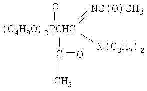 К раствору 2.08 г (0.0060 моль) N,N-диэтил-N’-ацетил-(дибутоксифосфорил)ацетамидина в 4 мл сухого диоксана при перемешивании и температуре 20÷30°С прибавляют небольшими порциями 0.14 г (0.0060 моль) натрия. Реакционную массу перемешивают до полного исчезновения натрия. К раствору полученного натриевого производного ацетамидина при перемешивании и температуре 20-30°С добавляют по каплям 0.81 г (0.0066 моль, 10% изб. мольн.) бромистого ацетила в 2 мл диоксана. Температуру реакционной массы повышают до 50°С и перемешивают в течение 1 часа. Соль бромида натрия отделяют фильтрацией, растворитель удаляют отгонкой в вакууме (при 15-20 гПа), остаток вакуумируют в течение 1 часа при 50°С и 2-4 гПа. Получают 2.0 г N,N-диэтил-N’-ацетил-(ацетилдибутоксифосфорил) этанамидина. Выход 86%. nD Спектр ЯМР 1H (CCl4), м.д.: 0.89 т (12Н, СН3); 1.28 м (8Н, CH2); 1.89 с (3Н,СН3С(O)); 1.96 с (3Н,СН3С(O)); 2.83 д (1Н, СНР); 3.24 к (4Н, NCH2); 3.98 м (4Н, CH2OP); ИК-спектр, Пример 2 N,N-дипропил-N’-ацетил-(ацетилдибутоксифосфорил)-этанамидин