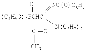 К раствору натриевого производного, приготовленного из 2.62 г (0.0069 моль) N,N-дипропил-N’-ацетил-(дибутоксифосфорил) ацетамидина и 0.16 г (0.0069 моль) натрия (по методике из примера 1) в диоксане (5 мл), при перемешивании и температуре 20÷30°С добавляют по каплям 0.59 г (0.0076 моль, 10% изб. мольн.) хлористого ацетила в 2 мл диоксана. Реакционную массу перемешивают в течение 3 часов при 50°С. Соль хлорида натрия отделяют фильтрацией, растворитель удаляют отгонкой в вакууме (при 15-20 гПа), остаток вакуумируют в течение 1 часа при 50°С и 2-4 гПа. Получают 2.42 г N,N-дипропил-N’-ацетил-(ацетилдибутоксифосфорил)этанамидина. Выход 84%. nD Спектр ЯМР 1Н (CCl4), м.д.: 0.89 т (12Н, СН3); 1.38 м (8Н, СН2); 1.88 с (3Н, СН3С(О)); 1.93 с (3Н, СН3С(О)); 2.76 д (1Н, СНР); 3.12 т (4Н, NСН2); 3.92 м (4Н, СН2OР); ИК-спектр, Пример 3 N,N-дипропил-N’-бензоил-(ацетилдибутоксифосфорил)-этанамидин