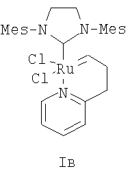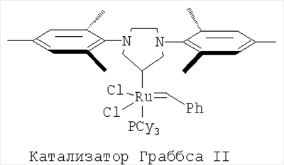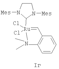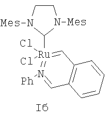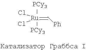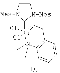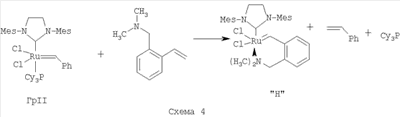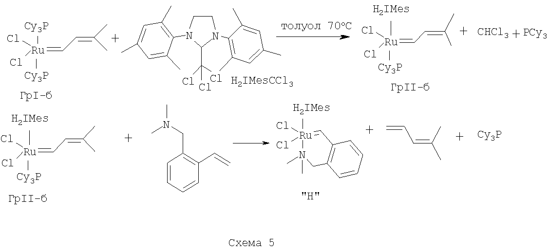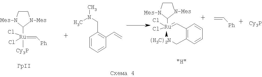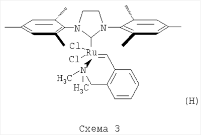 В другом варианте способ получения катализатора (Н) заключается в том, что катализатор Граббса I (первого поколения) последовательно в одном реакторе подвергают взаимодействию с 1,3-бис-(2,4,6-триметилфенил)-2-трихлорометилимидазолидином – хлороформенным аддуктом дигидроимидазола Н2IМеsССl3, а затем без выделения промежуточного продукта (катализатора Граббса II) с 2-(N,N-диметиламинометил)стиролом при нагревании в толуоле.
