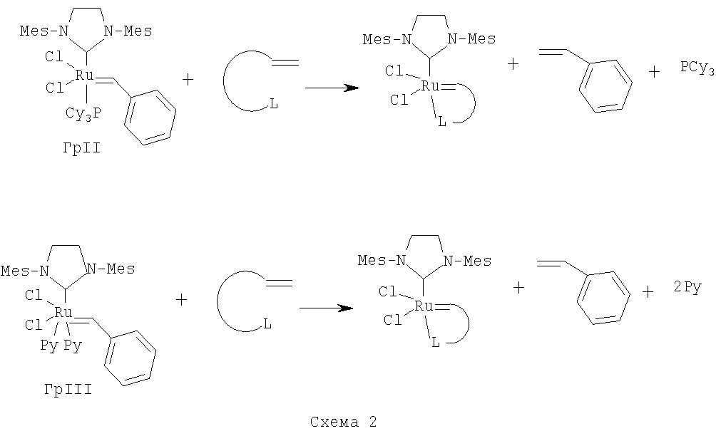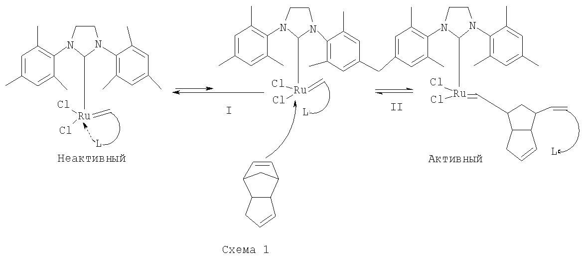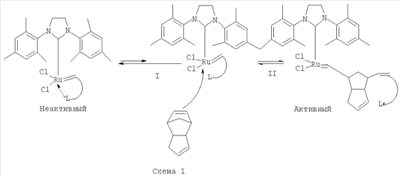 В представленных катализаторах замедленная активация катализаторов осуществляется за счет взаимодействия хелатирующего лиганда (L) с рутениевым карбеновым центром, что замедляет координацию молекулы мономера по кратной связи с активным центром катализатора. Каталитические свойства карбеновых комплексов рутения могут варьироваться электронными и стерическими эффектами лиганда L. Процесс активации катализатора представлен на Схеме 1: