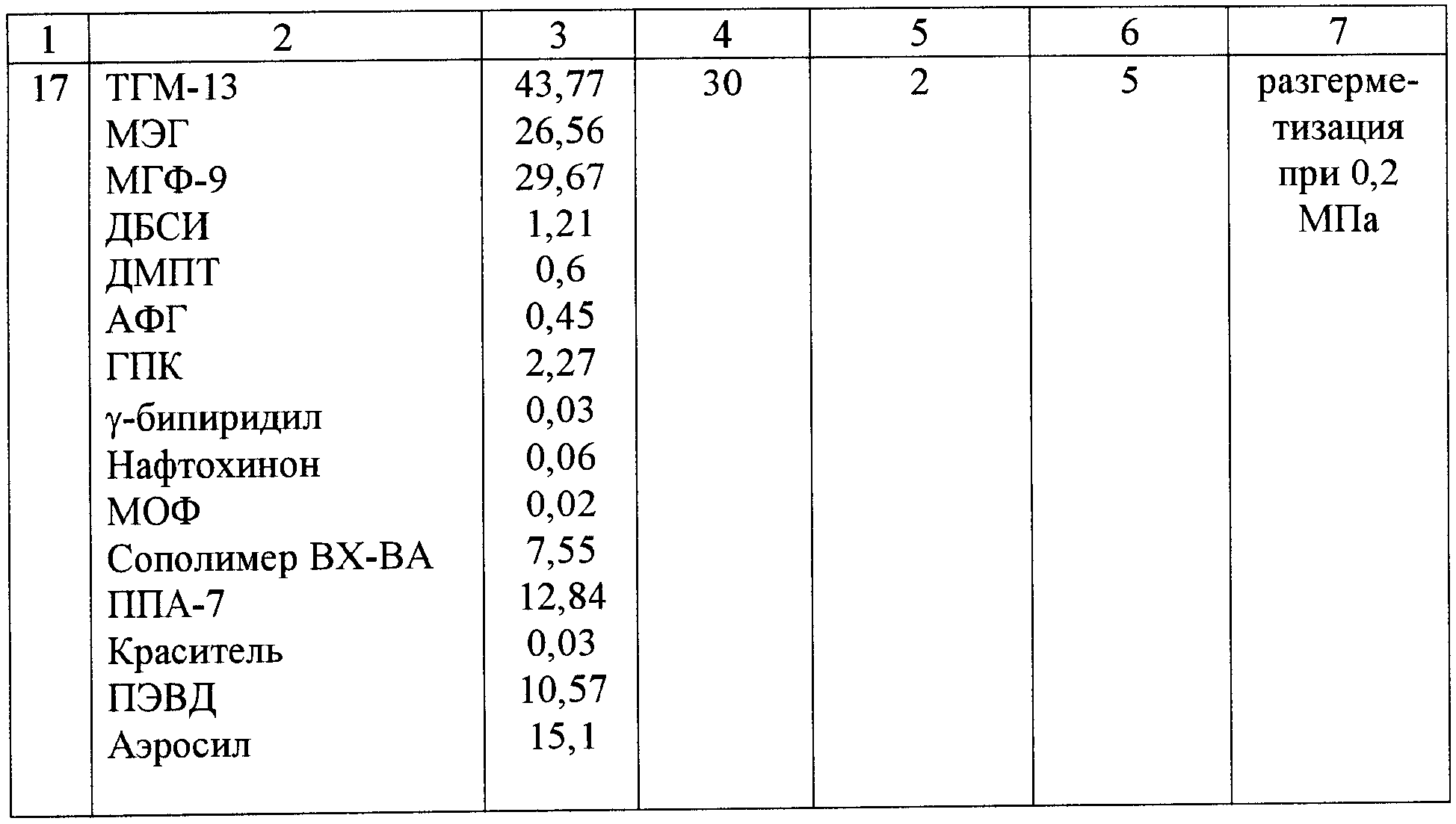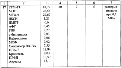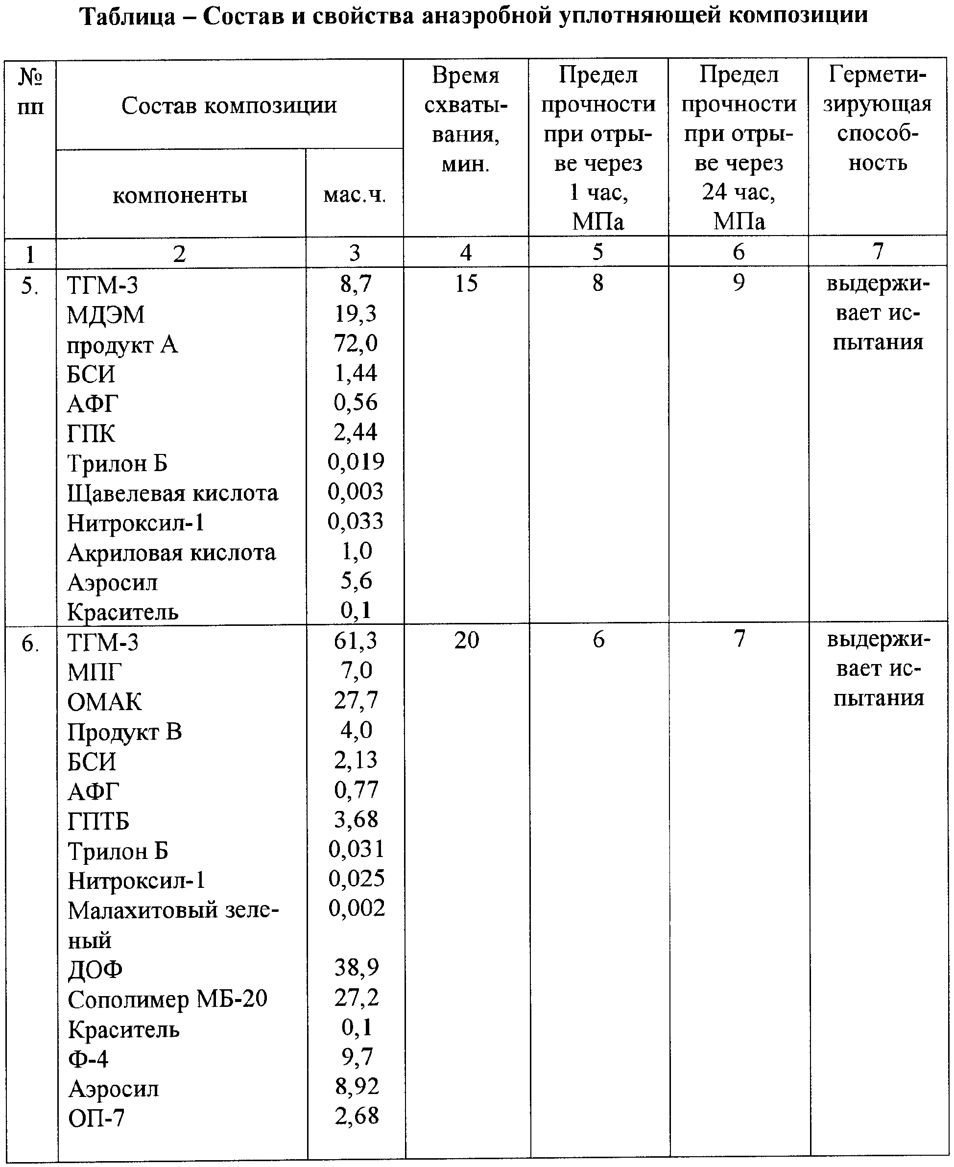Применяемые олигоуретан(мет)акрилаты синтезируют взаимодействием трех компонентов: – диола (полиоксипропилированного дифенилолпропана с концевыми гидроксиэтиленовыми группами, или оксиэтилированного дифенилолпропана, или полибутандиоладипината); – диизоцианата (триметилгексаметилендиизоцианата); – гидроксиэтилметакрилата. Отвержденные композиции при 25°С в течение 24 часов имеют прочность на сдвиг на стальных образцах 2,1-2,4 МПа. При прогреве этих образцов при 150°С в течение 30 суток указанные прочности возрастают до 3,7-4,1 МПа. Это свидетельствует о том, что композиция при 25°С за 24 часа отверждается на 57,5%, то есть неполностью. Можно сделать вывод, что композиция имеет небольшую скорость полимеризации при 25°С и вследствие этого не обеспечит требуемой герметичности через 45 минут после нанесения под давлением 0,6 МПа. Прототипом предлагаемого изобретения является анаэробная отверждаемая уплотнительная композиция по патенту ЕР1131363, C08F 20/18, опубл. 28.05.2003 г. Композиция включает, мас.%: