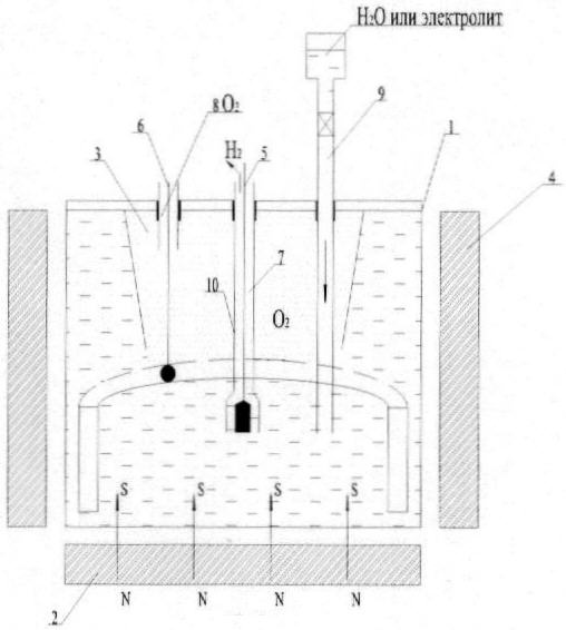 В диэлектрическую емкость 1 устройства через канал 7, плотно закрепленной к крышке 3, подают заранее подготовленный водный раствор электролита. При этом его уровень перекрывает нижнюю часть анода 5, которая находится в стеклянном чехле 10, для выхода водорода, катод 6 для выхода кислорода также находится в стеклянном чехле, конец которого не доходит до водного раствора электролита, причем нижняя часть катода 6 выполнена кольцевой и установлена по периметру внутри емкости 1. Кольцо из нержавейки имеет высоту 10 см, толщину 3 мм и диаметр ее на 4 см меньше внутреннего диаметра емкости 1, и оно крепится к корпусу емкости болтами. Емкость 1 устанавливают внутри электромагнитной катушки 4, расположенной над плоской спиральной катушкой 2. Включают источник тока и одновременно повышают нагрузку на спиральной катушке 2, электромагнитной катушке 4 и на электродах 5 и 6. По достижении энергии электромагнитного поля 25 кДж в каждой катушке, а также под действием электрического поля, которое образуется между кольцевым катодом 6 и анодом 5, происходит разложение воды на водород и кислород, а в устройстве обеспечивается дозированное поступление воды или свежего водного раствора электролита в емкость 1 по каналу 9 и удаление водорода по каналу 7 и кислорода по каналу 8, а также других конечных продуктов процесса через соответствующие каналы 8 и 9. При достижении величины тока 10 А и напряжения 12 В энергия магнитного поля в водном растворе электролита достигает от 25000 до 50000 Дж. Начало разложения водного раствора электролита на водород и кислород происходит при достижении энергии магнитного поля в водном растворе электролита 25000 Дж. Частота вращения водного раствора электролита максимальна в центре и уменьшается к периферии. Как и в прототипе, при вихревом движении жидкости в магнитном поле наблюдается повышение температуры у анода и понижение температуры у катода, которое связано с разложением воды. Понижение температуры за катодным кольцом объясняется тем, что процесс разложения воды на кислород и водород за счет восстановления их ионов сопровождается уменьшением энтальпии раствора, в результате чего температура раствора постоянно снижается, и, если не восполнять теплопотери, то раствор замерзнет и процесс прекратится. По этой причине в предлагаемом устройстве предусмотрен подогрев наружной поверхности емкости 1 теплом из окружающей среды или утилизируемым теплом. Внутри емкости водный раствор электролита под действием энергии магнитного поля вращается, и при достижении ее значения 25000-50000 Дж происходит разрушение водородной связи, и при этом за счет центробежных сил тяжелые отрицательно заряженные частицы накапливаются на внутренней поверхности емкости, а легкие положительно заряженные частицы водорода собирается в центре емкости. Следовательно, подведенная к устройству из окружающей среды тепловая энергия в результате совершения работы по деформированию гидратных связей ионов в водном растворе электролита полностью преобразуется в потенциальную химическую и электрическую энергии. Ее общий КПД существенно больше, чем у прототипа и в среднем составляет 0,87-0,93 за счет преобразования энергий магнитных полей электромагнитной и спиральной катушек, электрической энергии и тепловой энергии окружающей среды в химическую и электричес