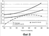Фиг.8 показывает соотношение между жесткостью по Таберу и гладкостью поверхности по Шеффилду для картонов с шаберным покрытием разными кроющими составами, без каландрования с каландрованием при давлении 50 и 100 ф/лин.дм.