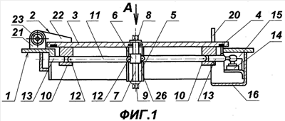 На крышке с нижней ее стороны закреплены направляющие 10, в которых подвижно установлены тяги 11, каждая из которых шарнирно связана с ползуном 6 пальцем 12. В каждой направляющей 10 установлена подвижно пиноль 13, которая связана со смежной тягой 10. Эта связь выполнена посредством второго пальца 12, аналогичного первому упомянутому пальцу.