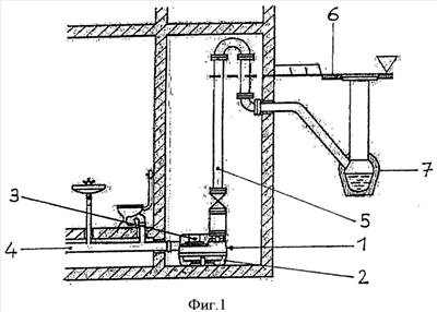 На Фиг.1 показан поперечный разрез здания, в подвале которого находится ассенизационное устройство. Сточные воды из ассенизационного устройства и другие жидкости, которые должны быть отведены, стекают в систему 1 для подъема сточных вод и собираются в ней, пока не будет достигнут достаточно высокий уровень заполнения для эпизодической перекачки. Система 1 для подъема сточных вод содержит непроницаемый для жидкости и непроницаемый для запахов резервуар 2 и расположенный герметично в нем насос 3 в виде насосной установка с приводом от электродвигателя, которая приспособлена для плавной перекачки таких жидкостей. Через впускную трубу 4 накопленные сточные воды втекают в резервуар 2, а через выпускную трубу 5 в виде напорного трубопровода их перекачивают через уровень 6 обратного потока, откуда они стекают в канализацию 7. Как правило, этот резервуар 2 снабжен вентиляцией (здесь она не показана), посредством которой обеспечивают откачку газов и предотвращают образование избыточного давления в резервуаре 2. Такой вентиляционный канал обычно выходит на крышу здания для предотвращения неприятных ощущений, вызываемых запахами.