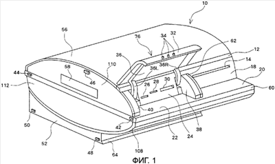Вдоль криволинейных краевых участков верхней левой боковины 110 и верхней правой боковины 116 прикреплена изогнутая пластинчатая алюминиевая крышка 56, закрывающая электронное устройство 10 сверху. Кроме того, вдоль криволинейных краевых участков нижней левой боковины 112 и нижней правой боковины 118 прикреплена изогнутая алюминиевая крышка 108. Эта алюминиевая крышка 108 и основание 52 закрывают основной кожух 10 снизу.